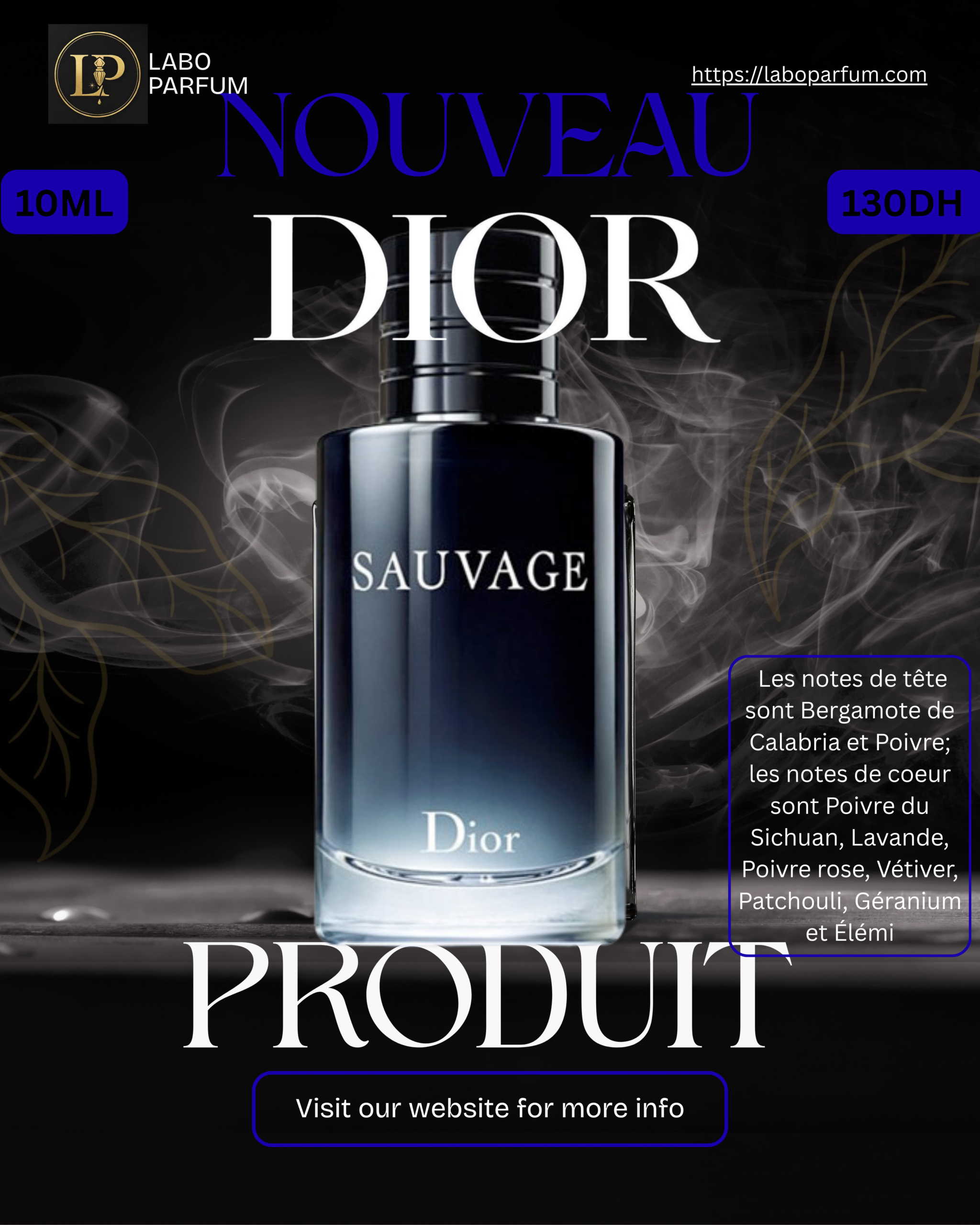 Sauvage de Dior est un parfum Aromatique Fougère pour homme. Sauvage a été lancé en 2015. Le nez derrière ce parfum est François Demachy. Les notes de tête sont Bergamote de Calabria et Poivre; les notes de coeur sont Poivre du Sichuan, Lavande, Poivre rose, Vétiver, Patchouli, Géranium et Élémi; les notes de fond sont Ambroxan, Cèdre et Ciste.